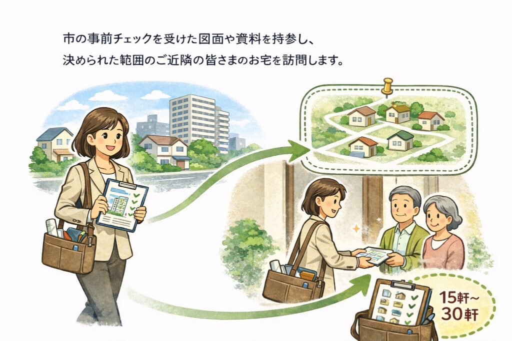 その後、市の事前チェックを受けた図面や資料を持参し、決められた範囲のご近隣の皆さまのお宅を訪問します。(大体、15軒から30軒ほどまわらせていただくことが多いです。)