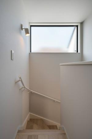 手すり壁となる部分をスチール手すりとする事で透過性が出て階段と他の空間がより一体的に感じる事が出来ます。
