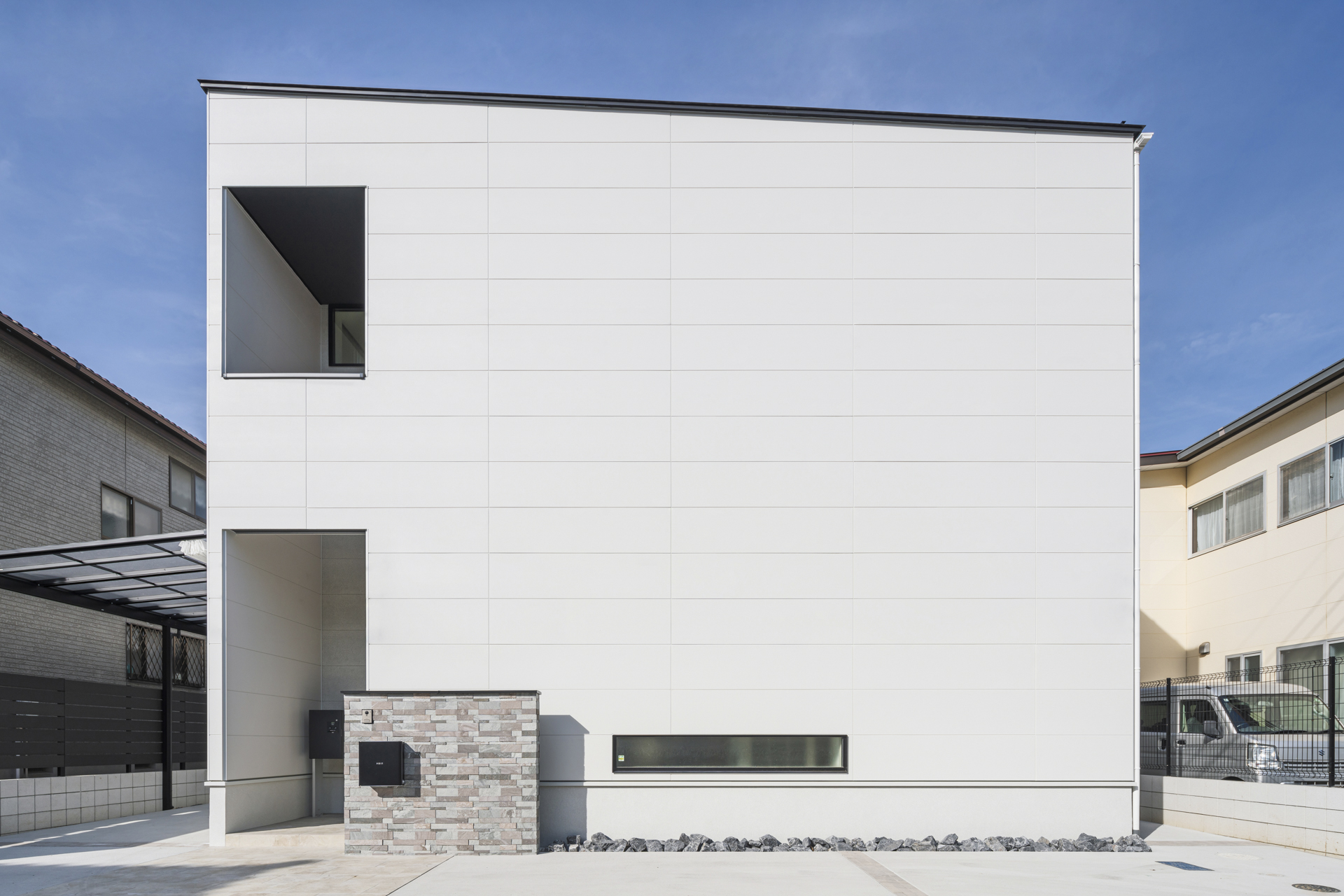 東南側の道路付となる敷地環境で、あえて道路側からの外観では大きな開口部を作らず、シンプルなファサードとしています。