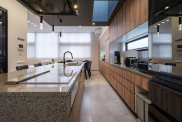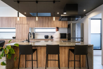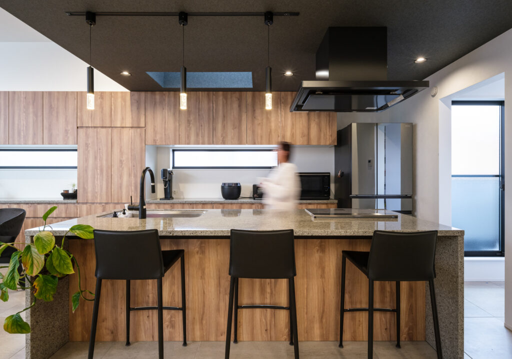 建物内部に足を踏み入れると、吹抜けのポーチ、塗り壁の玄関ホール、吹抜けと鉄骨階段の階段ホール、2階ホールと連続するアイランドキッチン、大開口を設けた天井高さ3mのリビングダイニングと、シーンごとに見せ場が続く空間構成となっています。