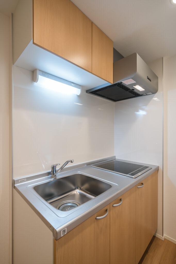 間取りのくふうとして、キッチンと就寝スペースの距離を出来るだけ取り、水回りには建具の設置を必須とするなど、生活の音や匂いへの配慮をしています。またコンパクトな空間ながら、生活に必要な設備をしっかりと揃えて、小さいけれどちゃんと暮らせるよう、バランスを考えて計画しました。外観は落ち着いた温かみのある色調で、足元に配置したグランドライトは夜の帰宅時間にも安心感を与えてくれるように思います。