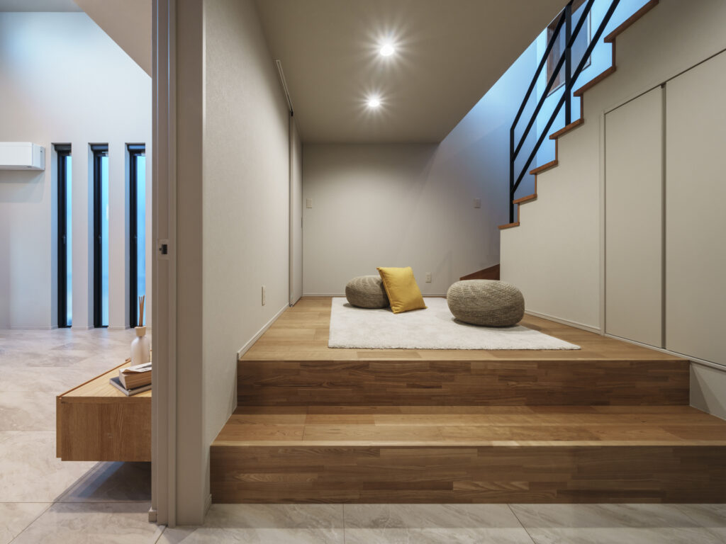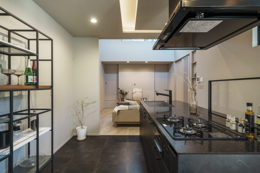 住まい手を『もてなす』ゆとりのあるアプローチとベージュ・マーブル柄を基調とした空間が日常を非日常へ。LDKから繋がるセカンドリビングでは、LDKとの境の扉を閉めることで来客時でもプライベートな空間として使うことが出来ます。また、日常の空間である洗面・ランドリー・主寝室をLDKから離すことでLDKでの非日常な暮らしを演出しています。