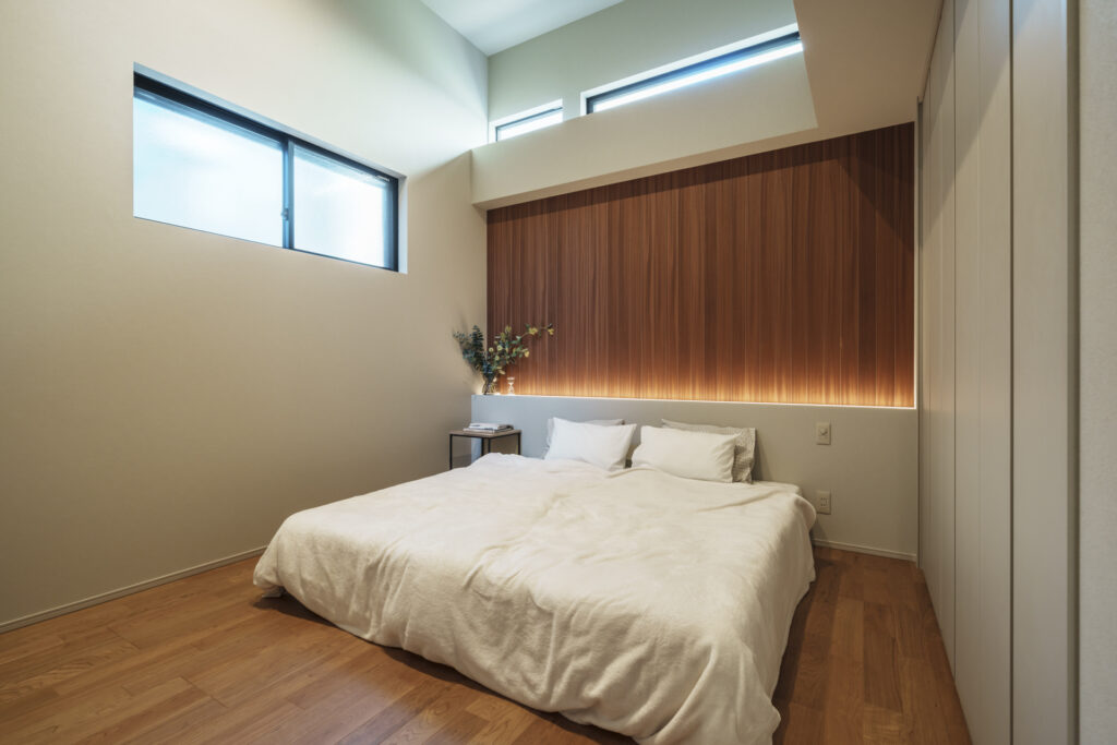 家の第一印象を決める玄関には吹抜を設け、開放的な玄関ホールを計画しています。さらにリビングと主寝室上の吹抜にはバルコニーに向かって窓を配置することで、空間の広がりとバルコニーとの一体感を演出しています。バルコニーに植栽を置けばリビングや主寝室からも自然を感じることが出来ます。