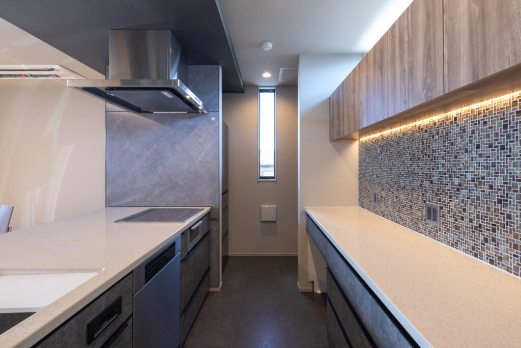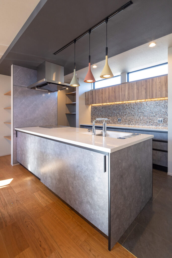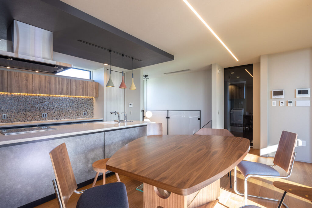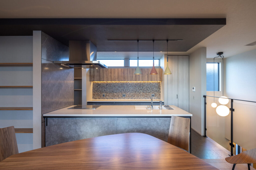 モザイクタイルと間接照明、下がり天井が印象的なキッチン空間。飾り棚の後ろに冷蔵庫を隠して、生活感を消しています。個性的なペンダントライトと不整形なダイニングテーブルがアクセントとなり、空間に彩りを与えます。