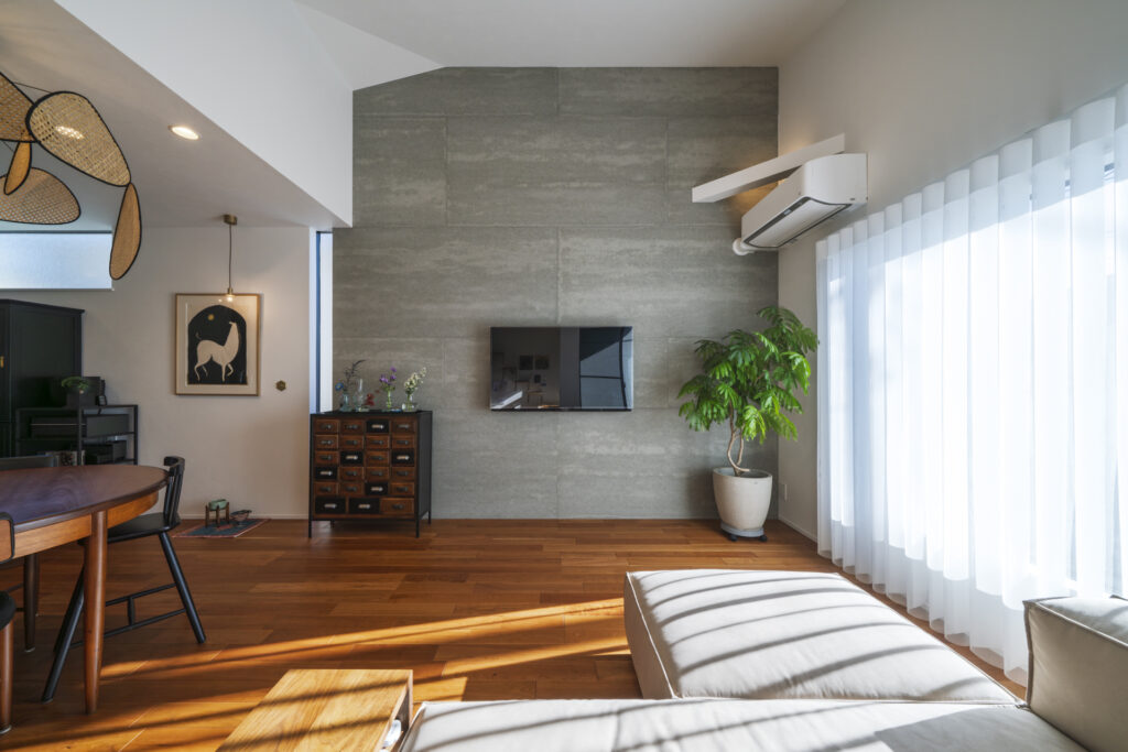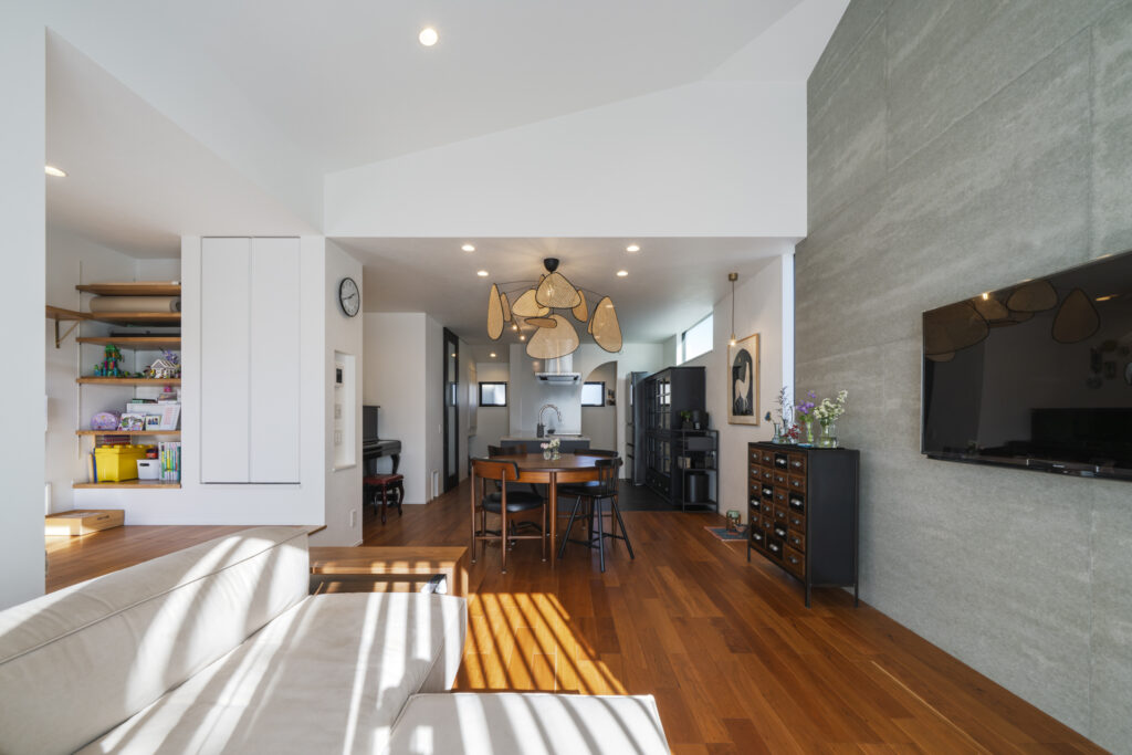 お気に入りの家具や照明が空間に馴染む中、猫と暮らす時間を気負いなく楽しむことの出来る住まいを目指しました。柔らかな光が差し込む伸びやかなリビングの中で、選び抜かれた家具がそれぞれの居場所を持ち、住まう方の想いをそっと映し出します。丁寧に吟味された素材や色づかいが空間の心地よさを支える中で、ご家族皆様の日々の暮らしがより豊かに感じられる住まいをとなりました。