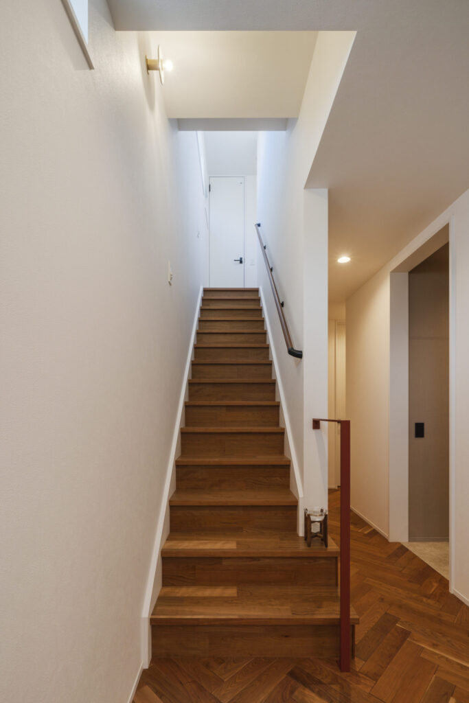 意匠性の高いヘリンボーンの床、臙脂色のアイアン手摺、天井高と合わせた建具など、お家に入って最初に目にする玄関ホールも素材や寸法にこだわりました。